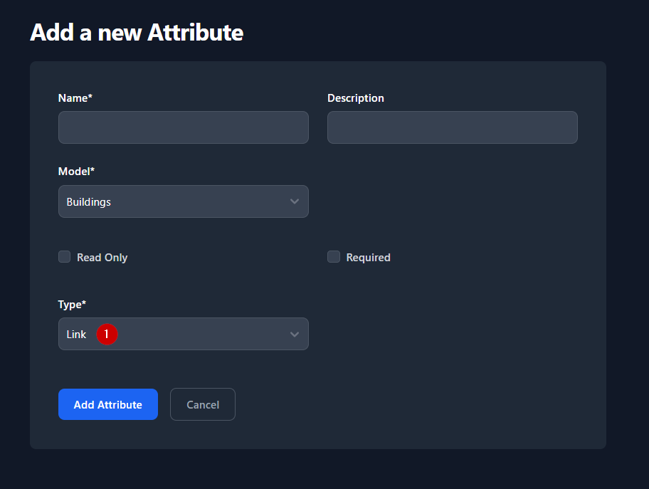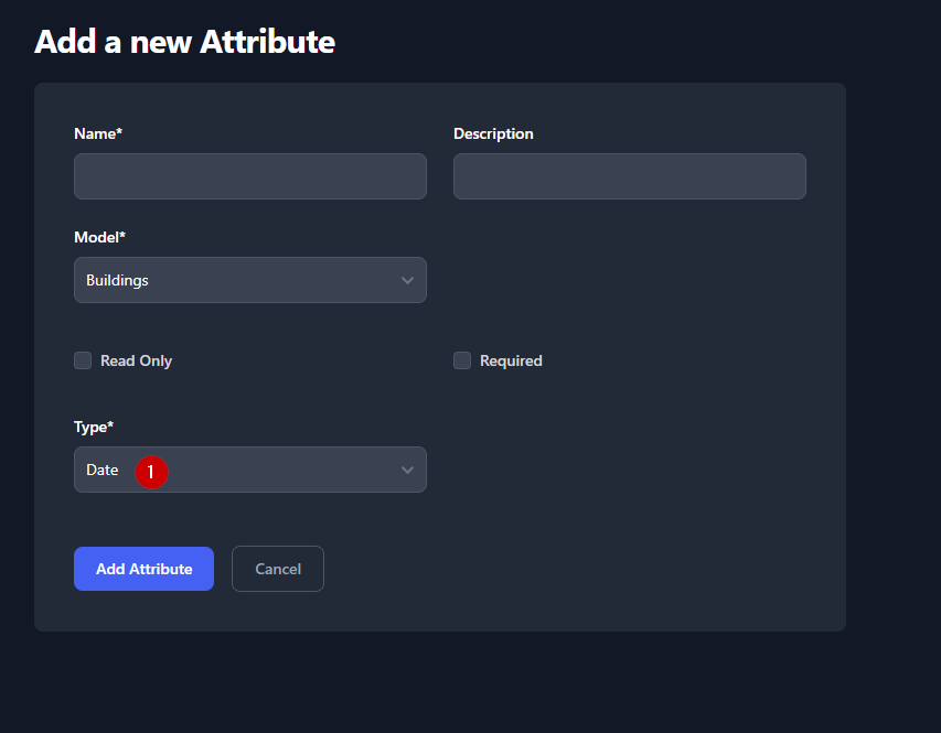 Beim Neuanlegen erscheinen die Attribute direkt bei Liegenschaft hinzugefügt. Wenn ein Attribut neu erstellt wird, wird es dem Modell hinzugefügt. Attribute bestehender Modelle können über die Aktionen (1) und 'Edit' (2) bearbeitet werden.