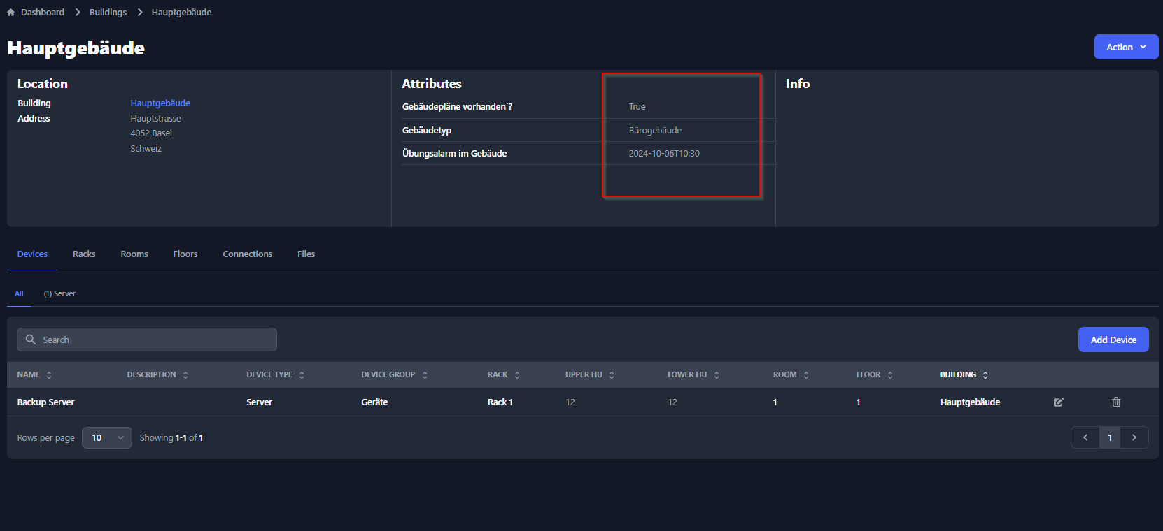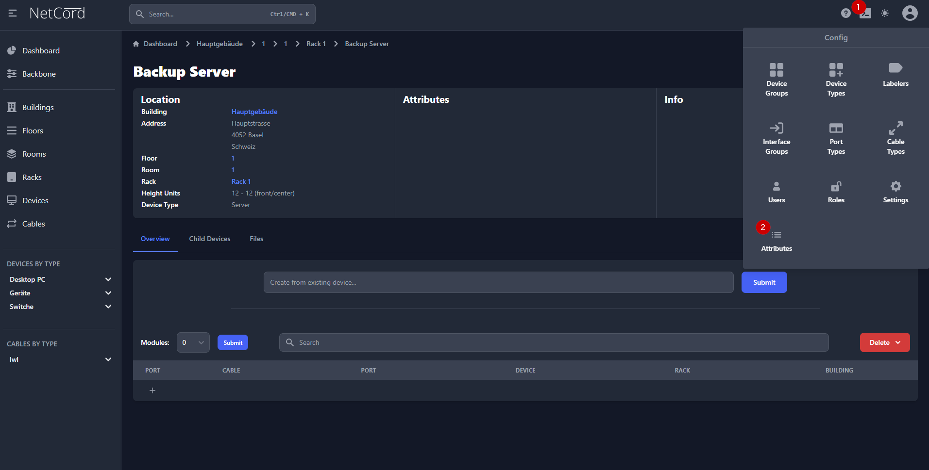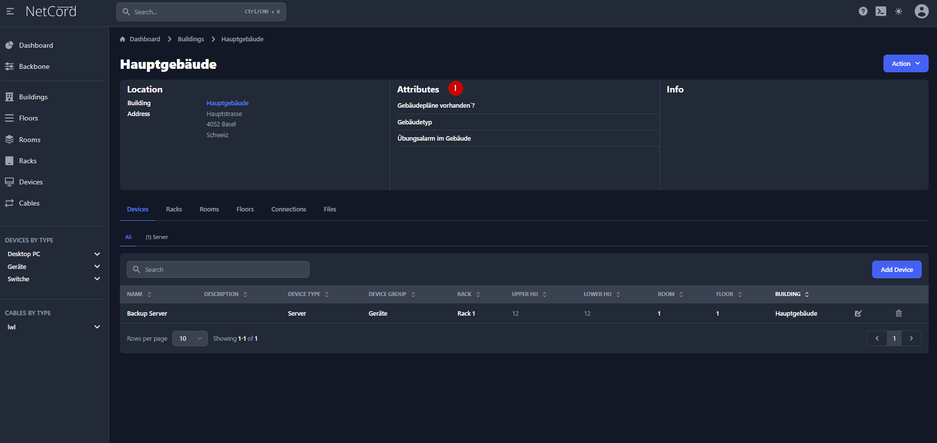 Attribute können für alle "Geräte" erfasst werden, einschliesslich Gruppen wie Gebäude, Racks, Kabel, Etagen, Räume und mehr. Nach der Erstellung und Zuweisung werden die Attribute im mittleren Übersichtsbereich (1) angezeigt.