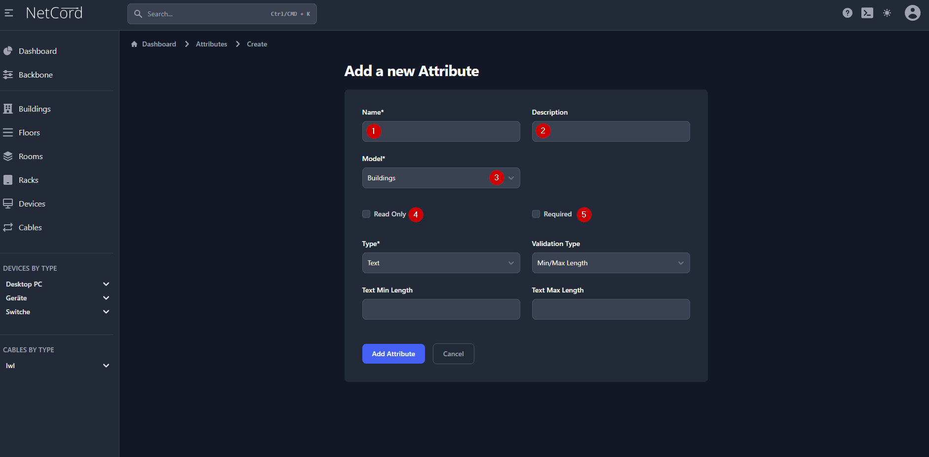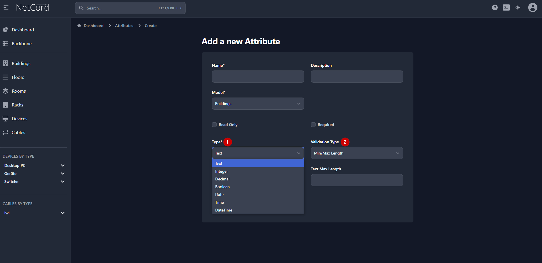 Mit der neuen Attributverwaltung in NetCord können Sie individuelle Eigenschaften für Geräte, Racks, Kabel, Gebäude, Etagen und Räume definieren und verwalten. Diese Attribute ermöglichen es, spezifische Informationen zu erfassen und gezielt zuzuweisen. Sie können dabei verschiedene Feldtypen und Validierungen nutzen, um sicherzustellen, dass die eingegebenen Daten den gewünschten Anforderungen entsprechen.