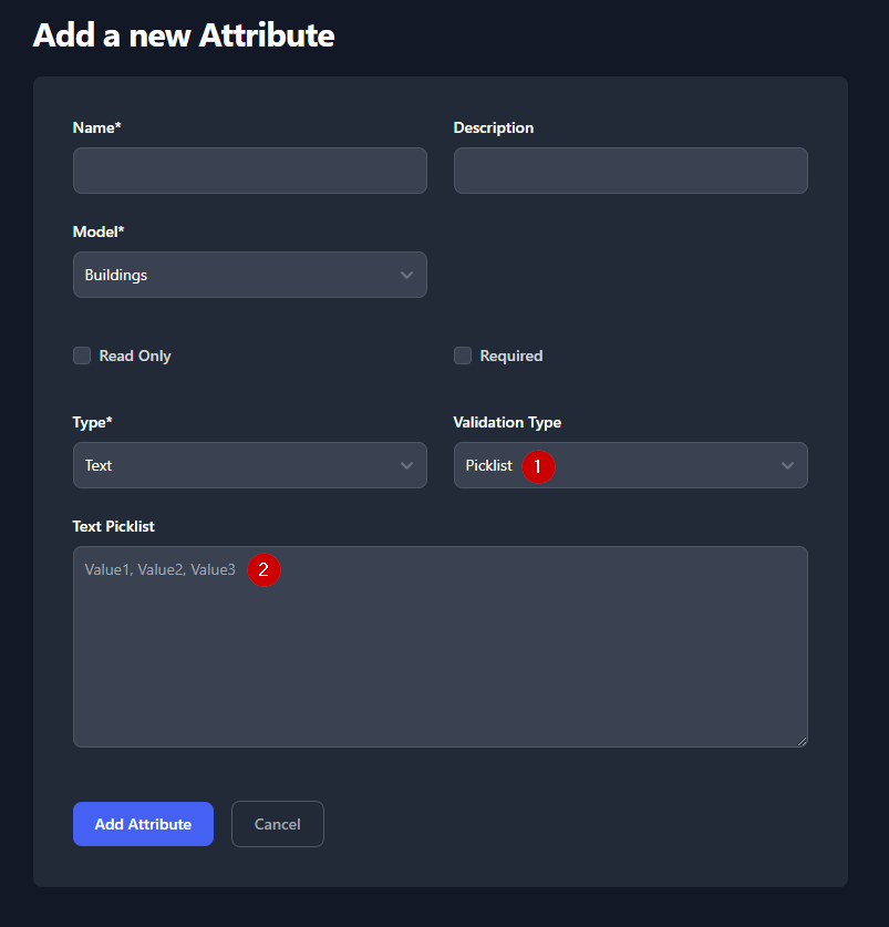 Wenn der Typ 'Text' ausgewählt und der Validierungstyp (1) 'Picklist' ist, können unter (2) die Picklist mit durch Kommas getrennten Werten erstellt werden, um eine Auswahl an möglichen Werten zu ermöglichen.