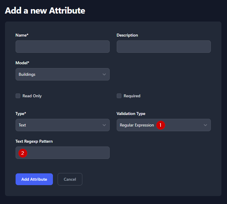 Wenn der Typ 'Text' ausgewählt und der Validierungstyp (1) 'Regular Expression' ist, kann unter (2) die Regex eingegeben werden, um die Eingaben entsprechend einem definierten Muster zu validieren.