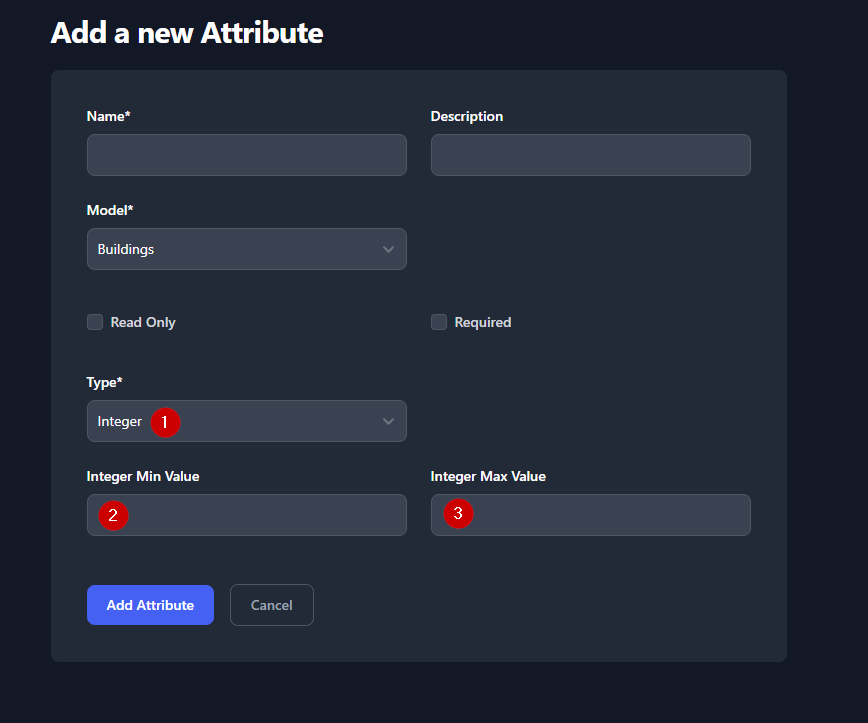 Wenn der Typ 'Integer' (1) ausgewählt ist, kann sichergestellt werden, dass nur ganze Zahlen (positive oder negative) in das Eingabefeld eingegeben werden. Über den Integer min Value (2) wird die niedrigste erlaubte Zahl festgelegt, während über den Integer max Value (3) die höchste erlaubte Zahl definiert werden kann.
