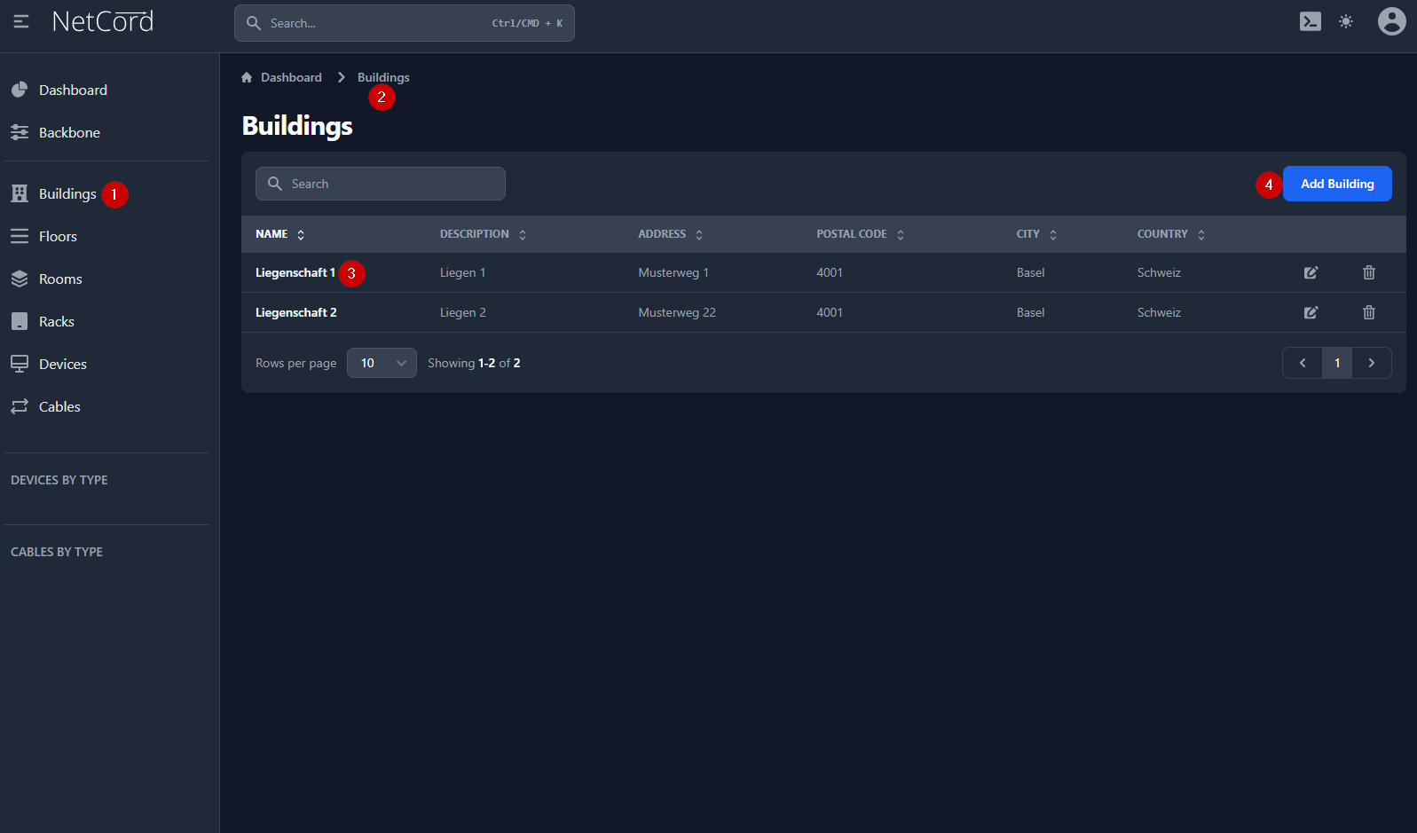 In diesem Abschnitt wird erläutert, wie Liegenschaften in der Anwendung verwaltet werden können. Eine Liegenschaft repräsentiert eine physische Struktur und beinhaltet verschiedene Informationen wie Adresse, Beschreibung und andere relevante Daten.