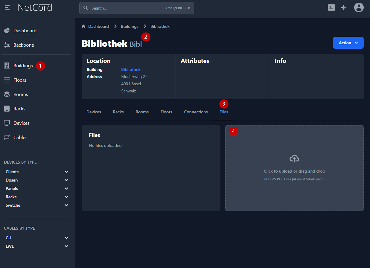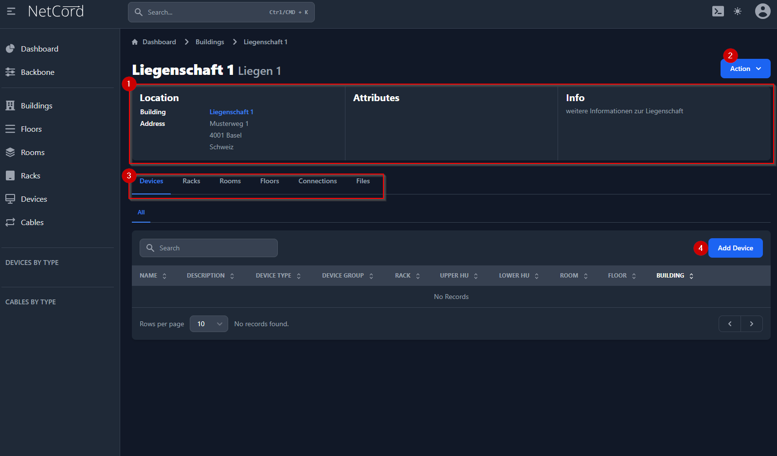Wenn eine spezifische Liegenschaft ausgewählt wird, wird die Detailansicht dieser Liegenschaft präsentiert. Hier finden Sie alle relevanten Informationen zur Liegenschaft sowie die dazugehörigen Räumlichkeiten und Geräte.