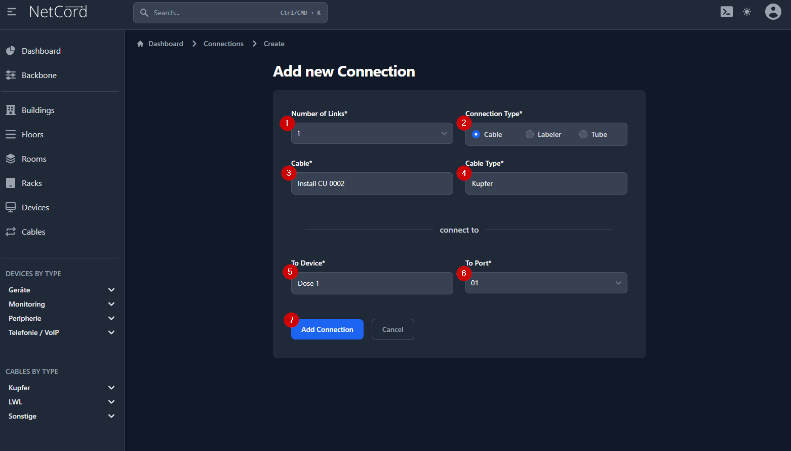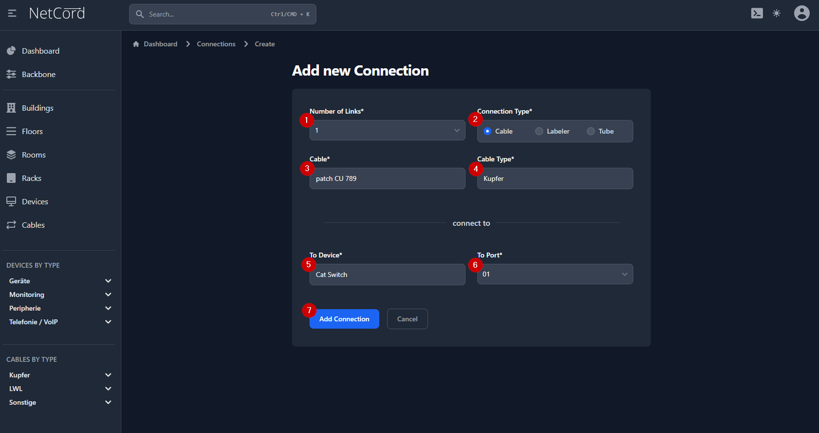 - Geben Sie die Beschriftung für das Kabel ein. In unserem Beispiel ist das "patch CU 789"