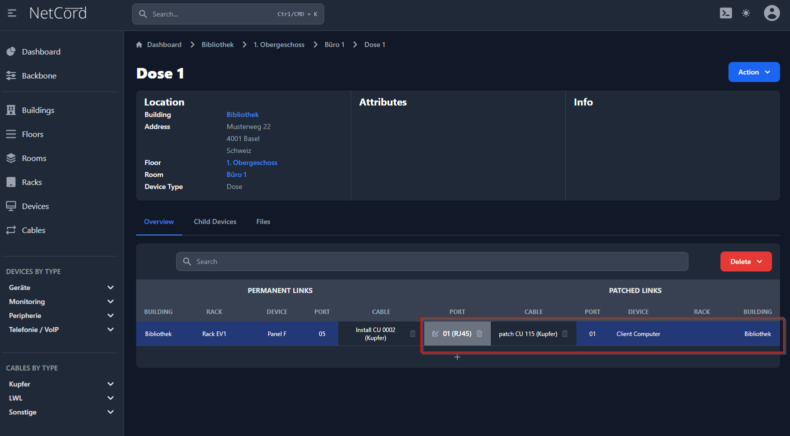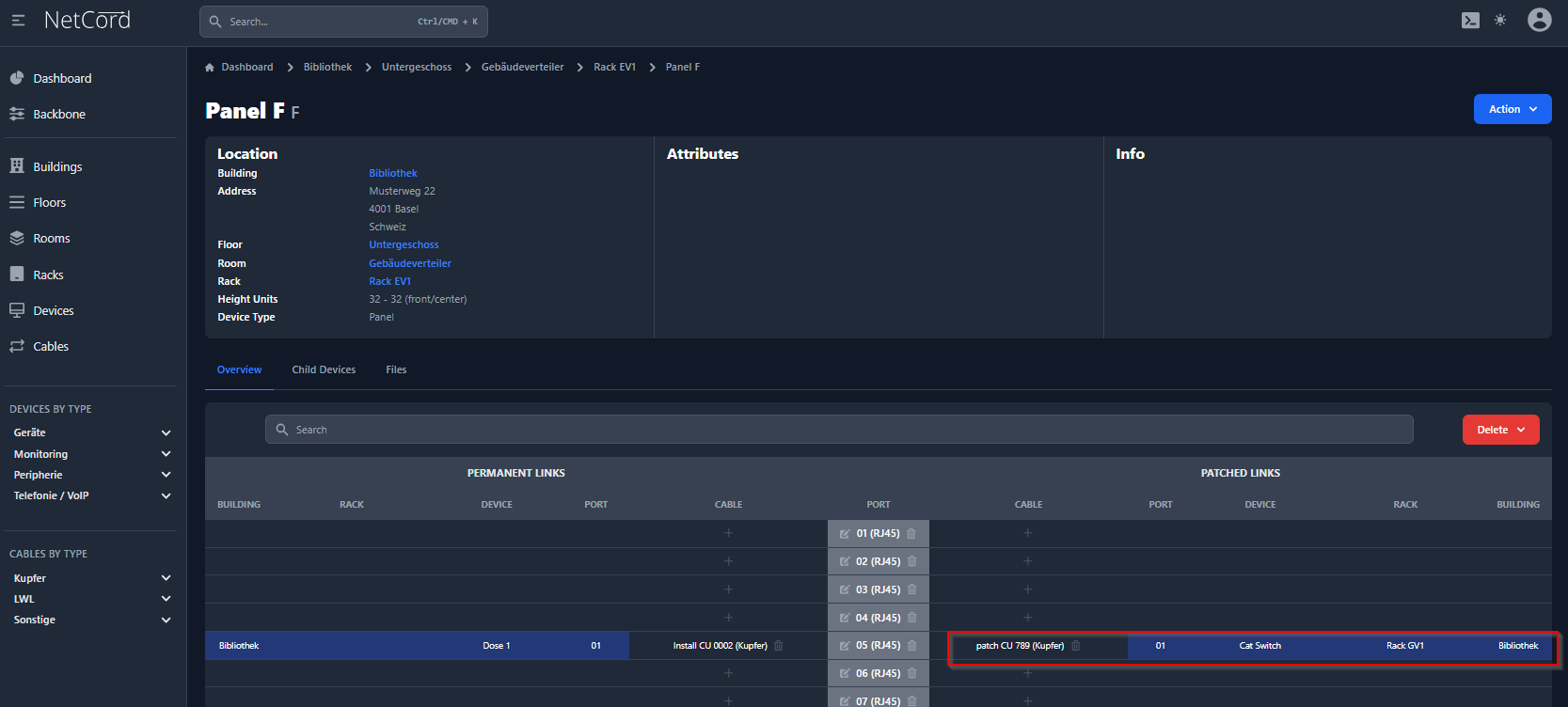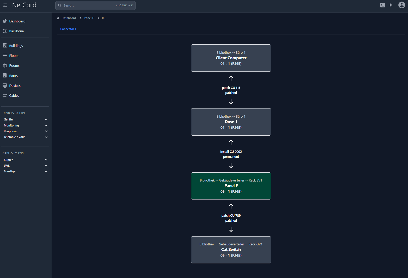 Hier wird der Verlauf der Verbindungen (festinstallierte Kabel, Patchungen und Geräte) bildlich dargestellt. Diese visuelle Darstellung ermöglicht es Ihnen, den Aufbau und die Struktur Ihres Netzwerks intuitiv zu verstehen und zu verwalten. Sie können die Verbindungen zwischen verschiedenen Netzwerkkomponenten anzeigen, einschließlich der physikalischen und logischen Verbindungen. Dies hilft bei der Fehlersuche, Planung und Dokumentation Ihrer Netzwerkarchitektur.