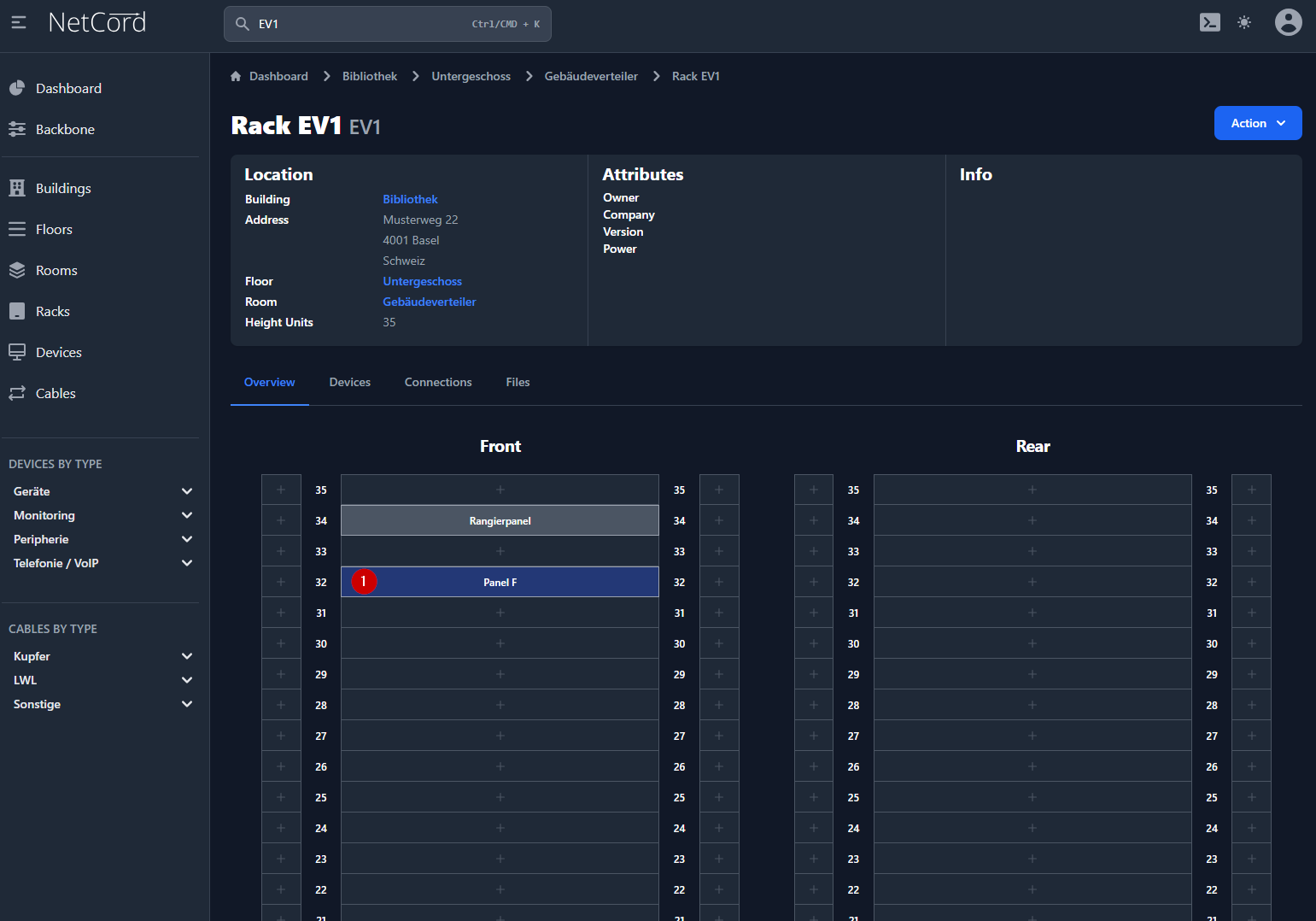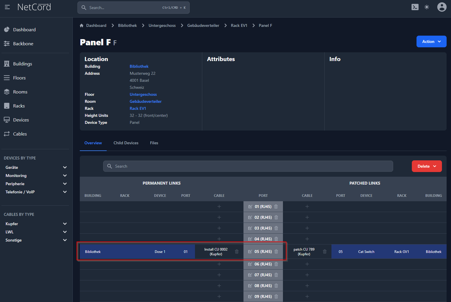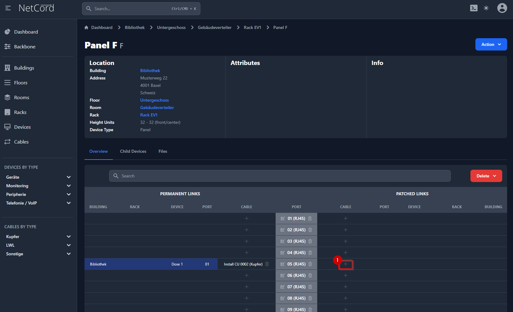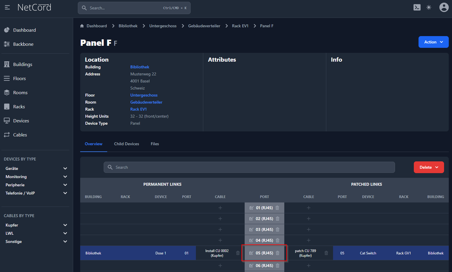 Hier wird der Verlauf der Verbindungen (festinstallierte Kabel, Patchungen und Geräte) bildlich dargestellt. Diese visuelle Darstellung ermöglicht es Ihnen, den Aufbau und die Struktur Ihres Netzwerks intuitiv zu verstehen und zu verwalten. Sie können die Verbindungen zwischen verschiedenen Netzwerkkomponenten anzeigen, einschließlich der physikalischen und logischen Verbindungen. Dies hilft bei der Fehlersuche, Planung und Dokumentation Ihrer Netzwerkarchitektur.