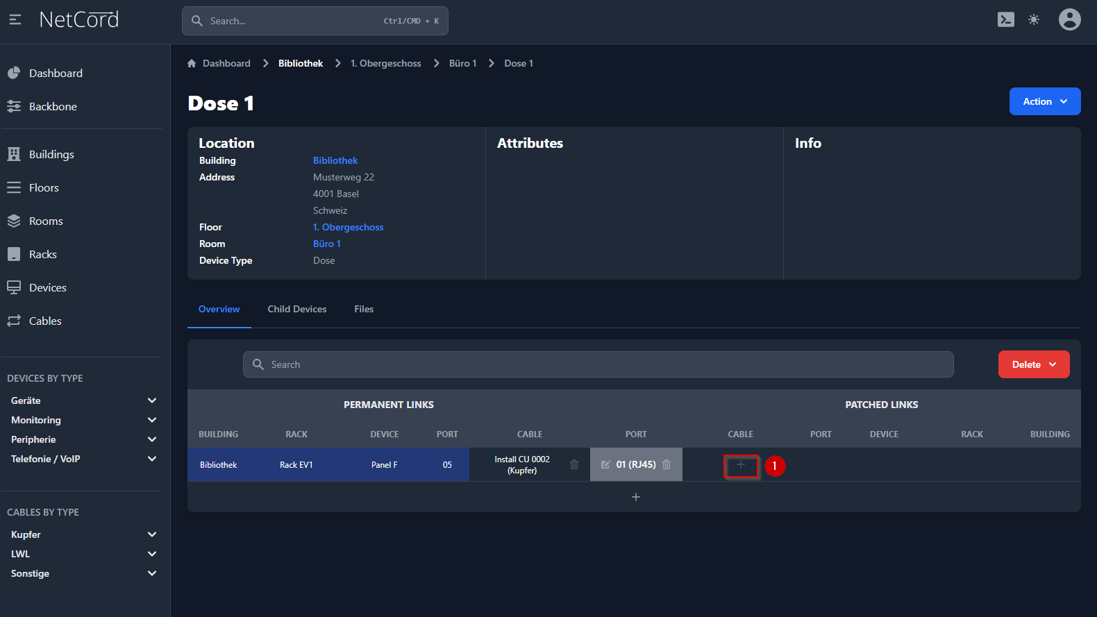 Unter Patchverbindungen bei dem Port, wo die Dose terminiert, auf "+" klicken (1).