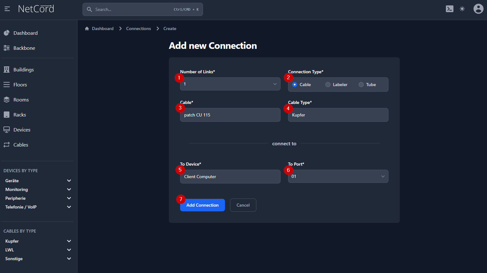- Geben Sie die Beschriftung für das Kabel ein. In unserem Beispiel ist das "patch CU 115"