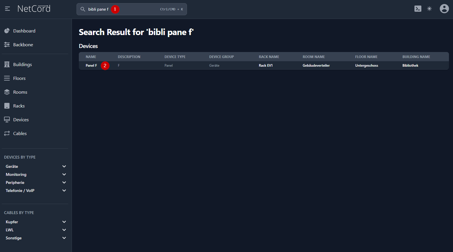 Im Suchfeld nach dem Panel F suchen (im Beispielbild haben wir nach "bibli pane f" gesucht) (1) und dann das entsprechende Panel anklicken (2).