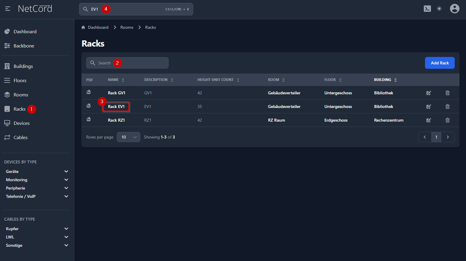 In der Seitenleiste auf "Racks" (1) klicken, im Suchfeld die Rack ID oder Name eingeben (2) (alternativ kann im Haupt Suchfeld nach dem Rack gesucht werden (4)) und dann das entsprechende Rack anklicken (3).