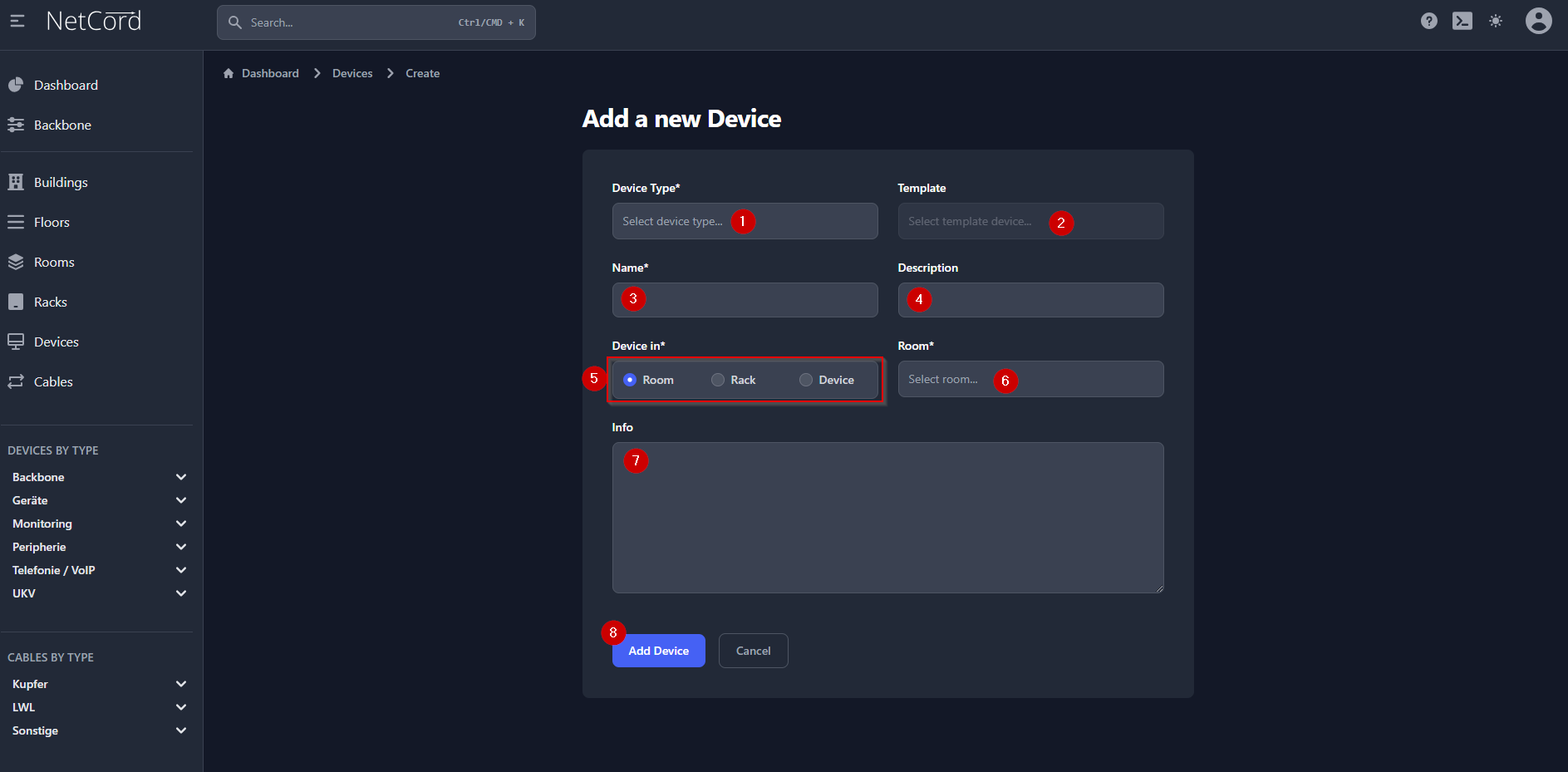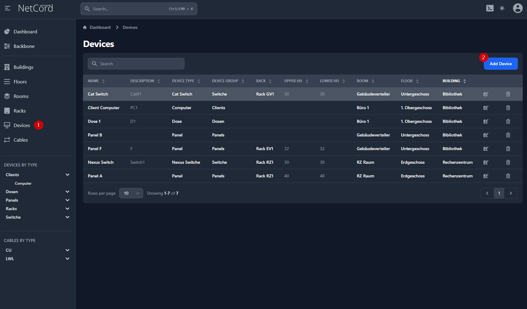 In der Seitenleiste auf "Devices" (1) und anschliessend auf "Add Device" (2) klicken: