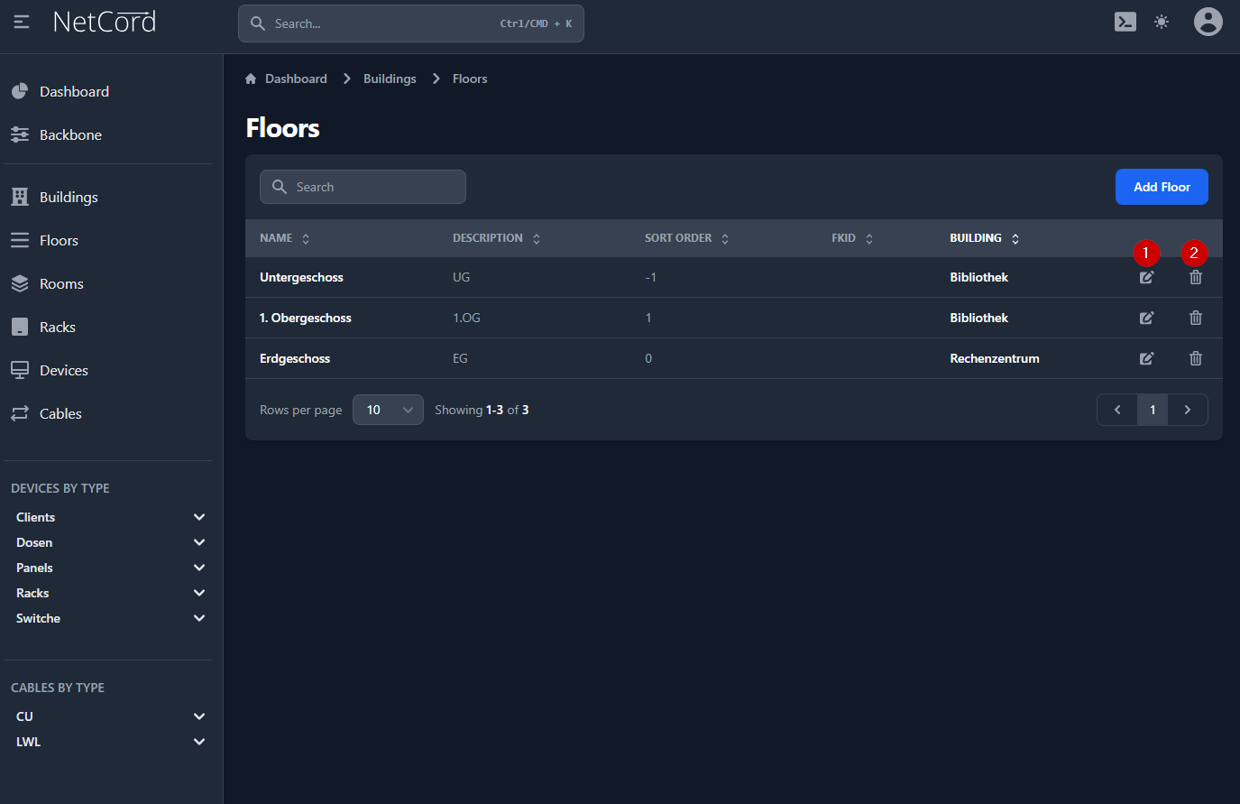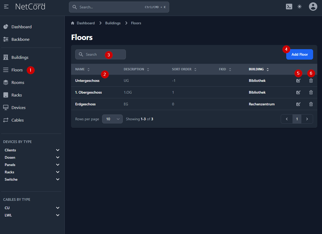 - Löschen: Entfernt das Stockwerk aus der Datenbank.