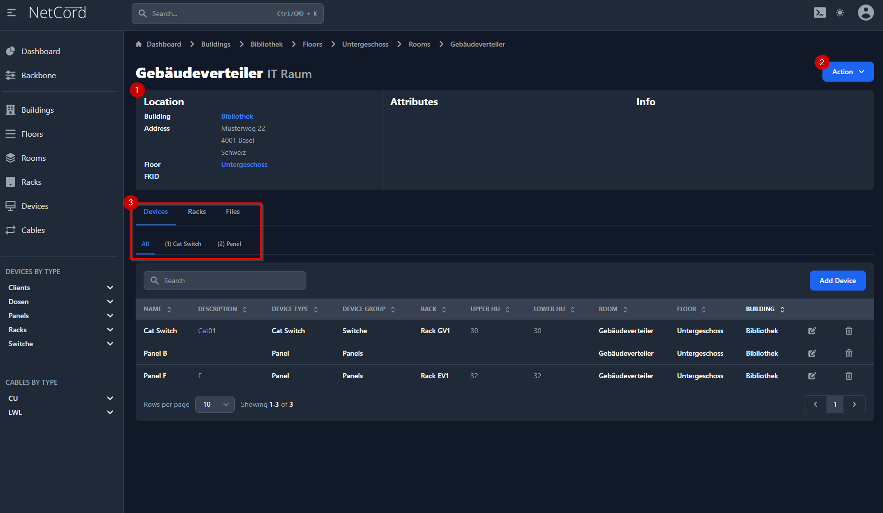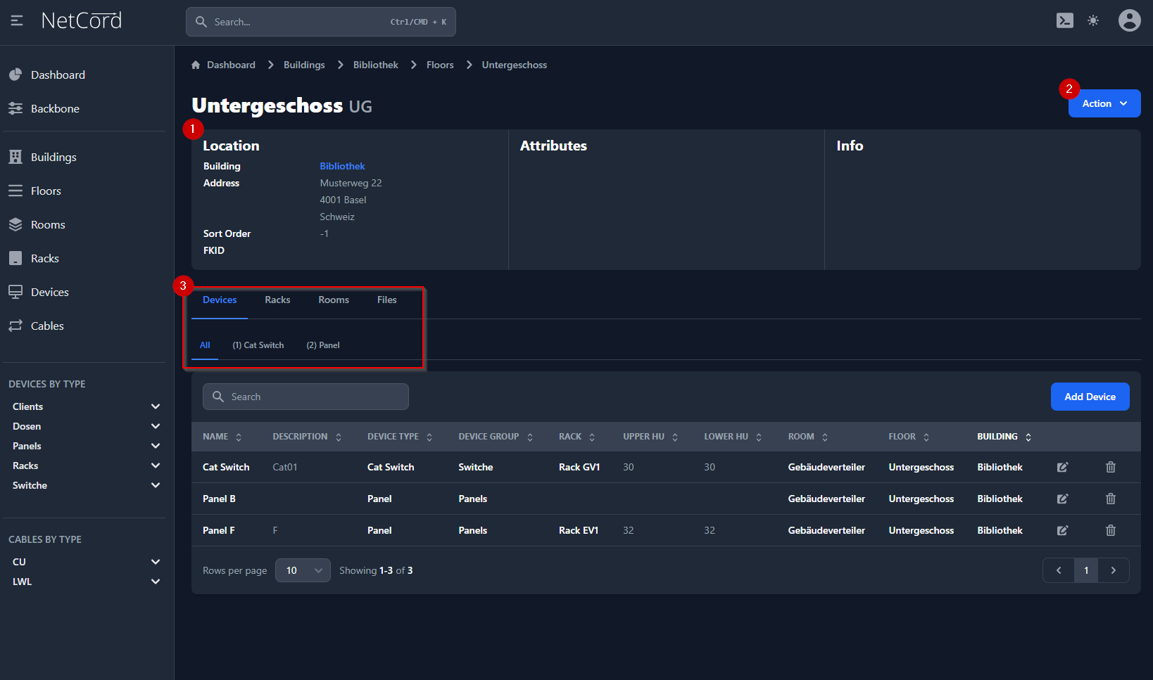 - Standort: zeigt Informationen über den Standort des Stockwerks an. Es wird angezeigt, in welcher Liegenschaft sich das Stockwerk befindet. Ausserdem wird die Anzahl der enthaltenen Räume, Racks und Geräte angezeigt.