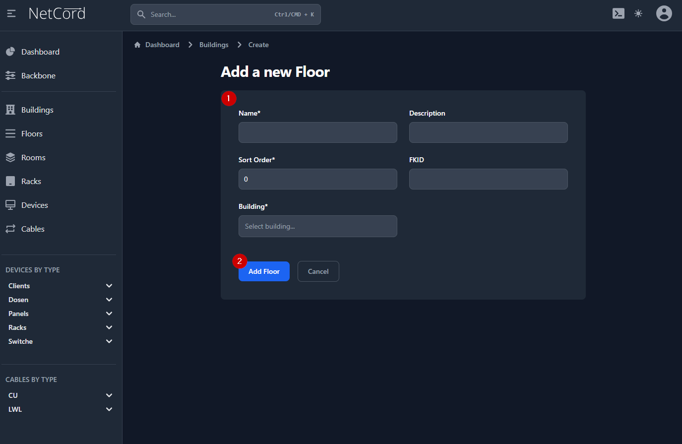 - Building: Dropdown-Menü zur Auswahl der Liegenschaft, in dem sich das Stockwerk befindet.