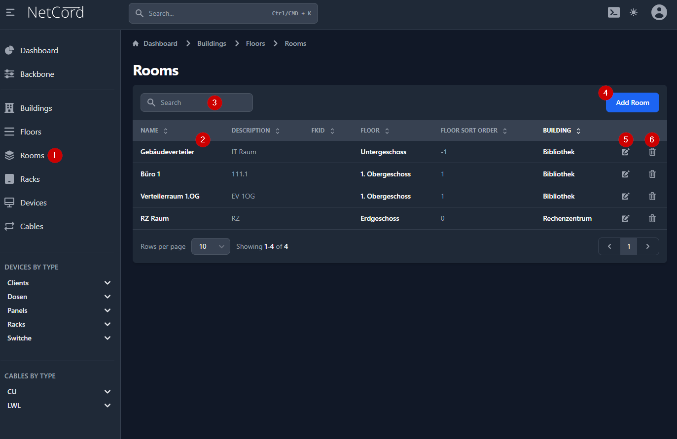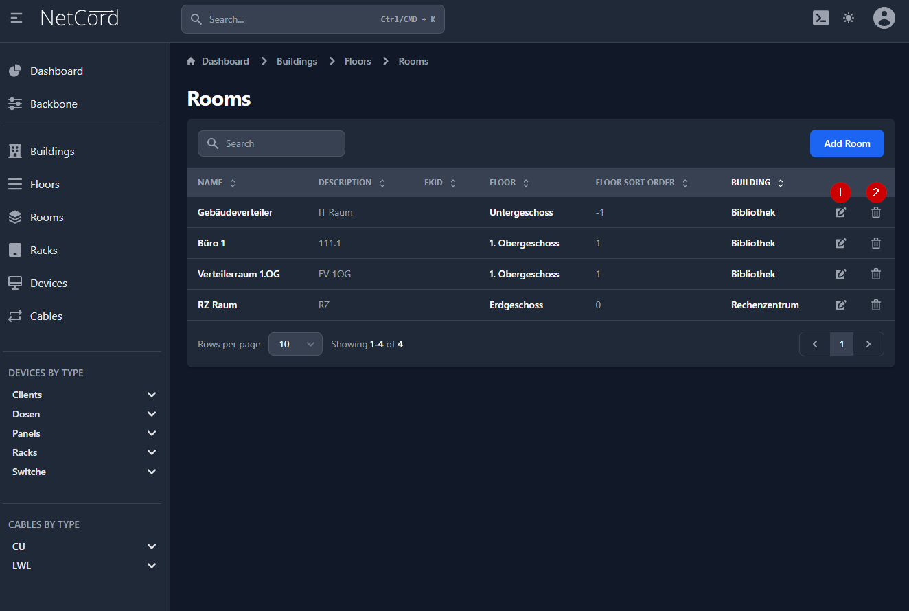 - Löschen: Entfernt den Raum aus der Datenbank.