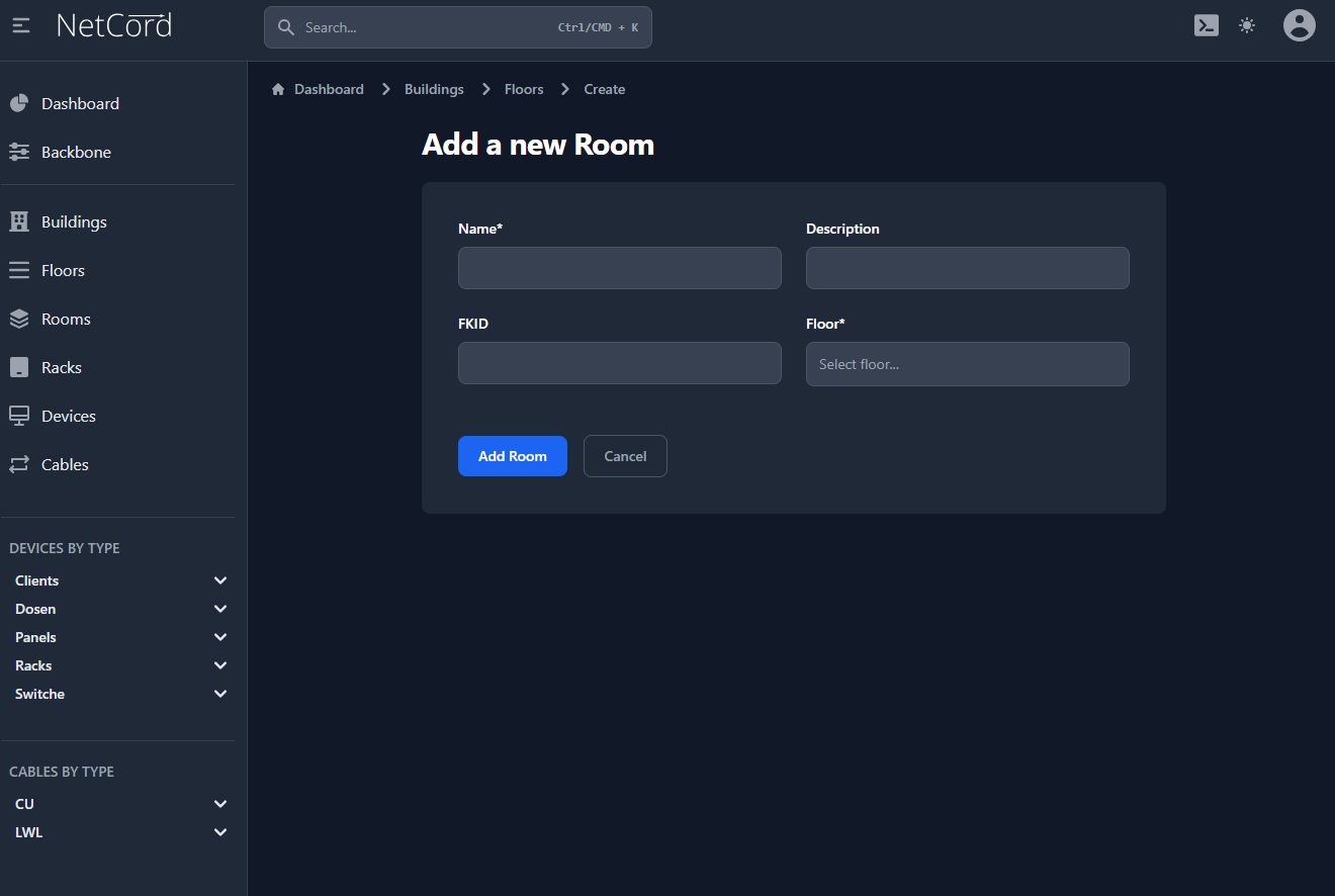 - Bezeichnung: Textfeld zur Eingabe der Bezeichnung des Raums.