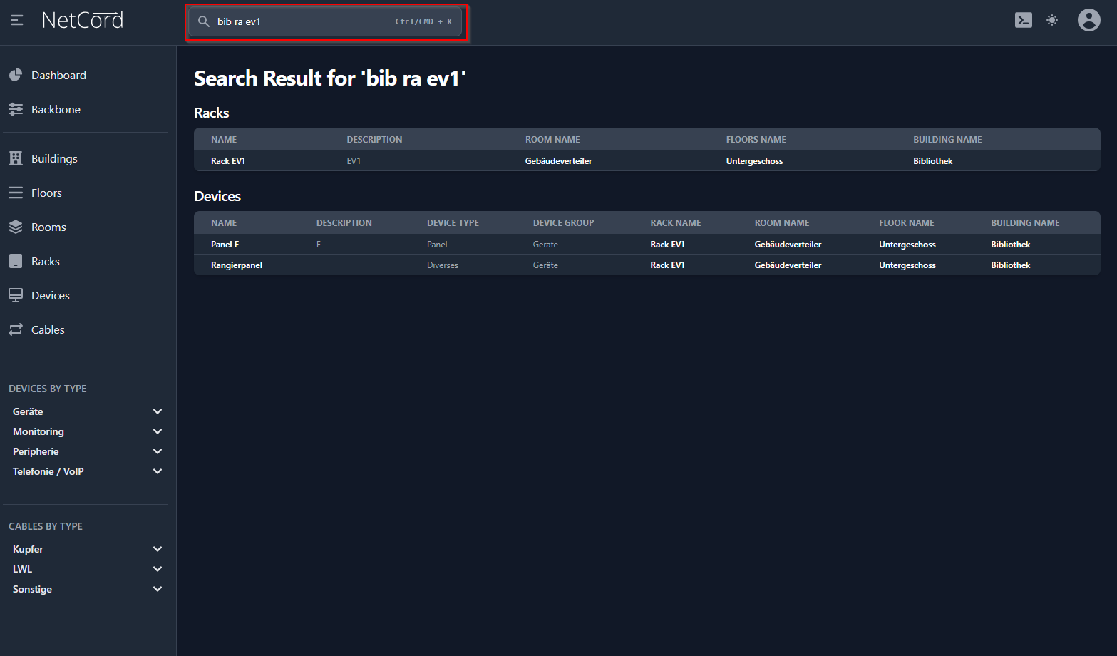 Beispiel: Suchen nach einem Rack in einem Gebäude